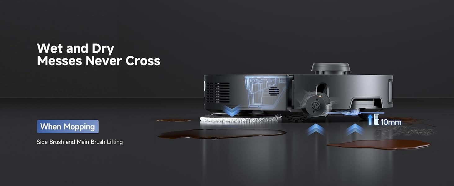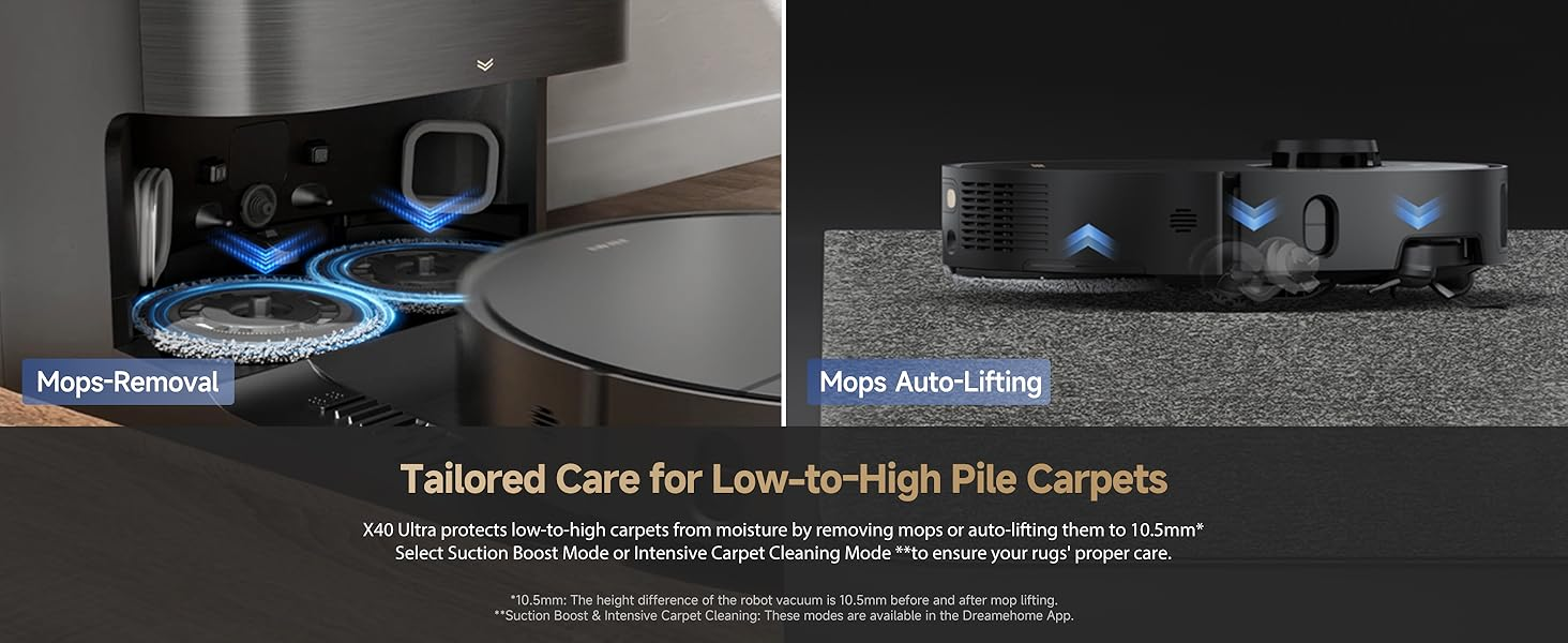 Keep Carpets Dry with a Removable & Liftable Mop: X40 Ultra protects carpets from moisture by removing mops or auto-lifting them to 10.5mm(0.41inch). Set zones to avoid rugs, reducing the risk of getting stuck.
