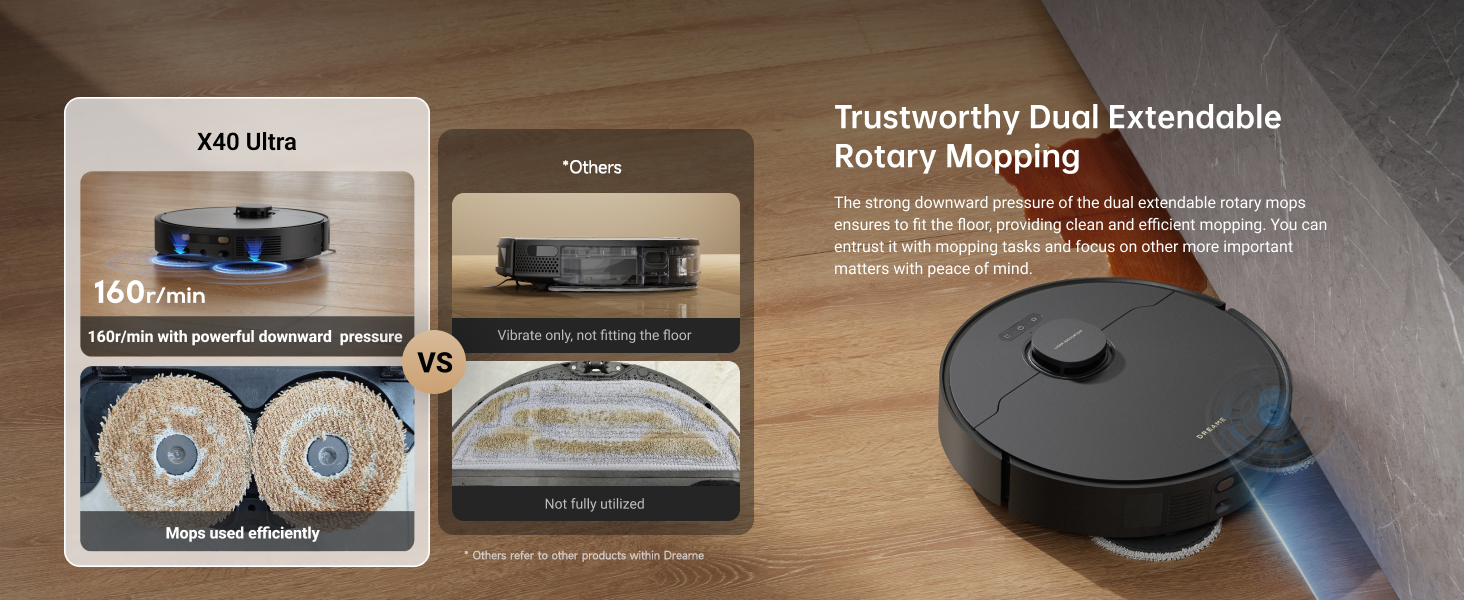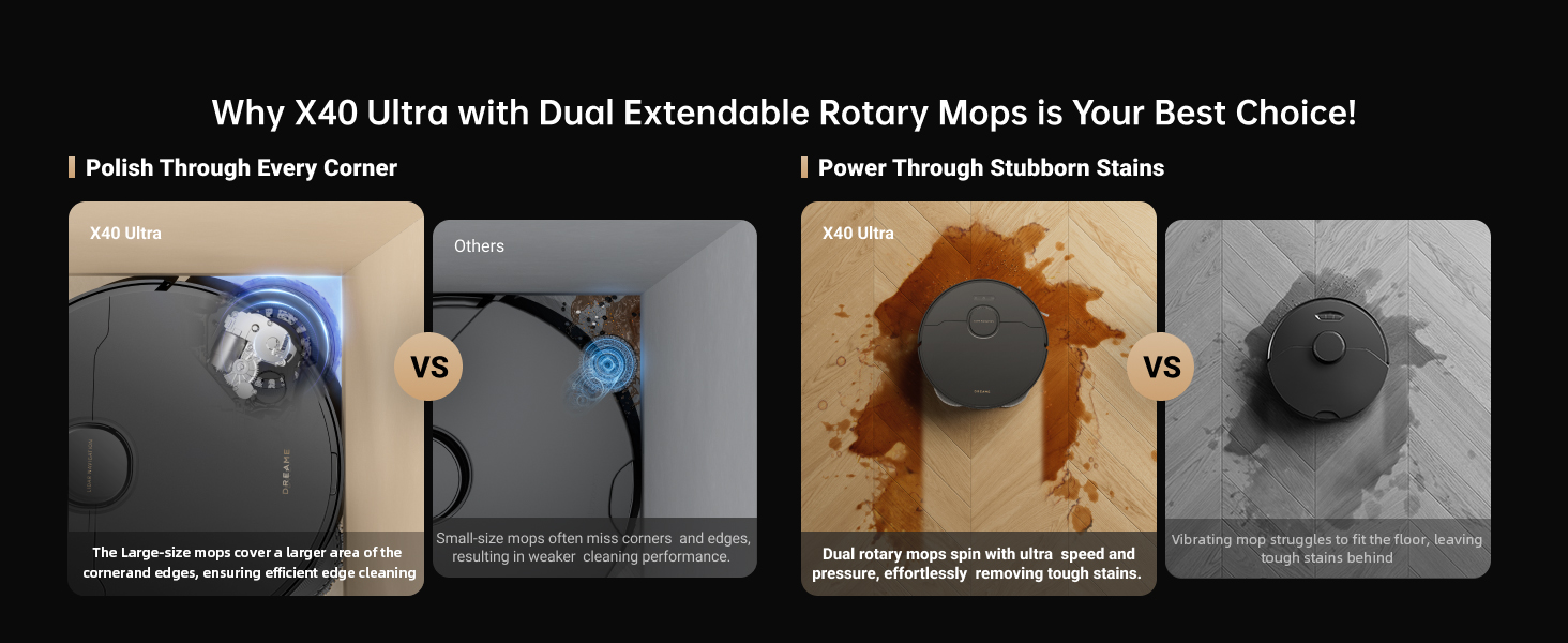 Smartly Fight Stubborn Dirt : With the help of OmniDirt detection and MopExtend RoboSwing technologies, X40 Ultra detects tough messes and scrubs them deep under low furniture and corners.