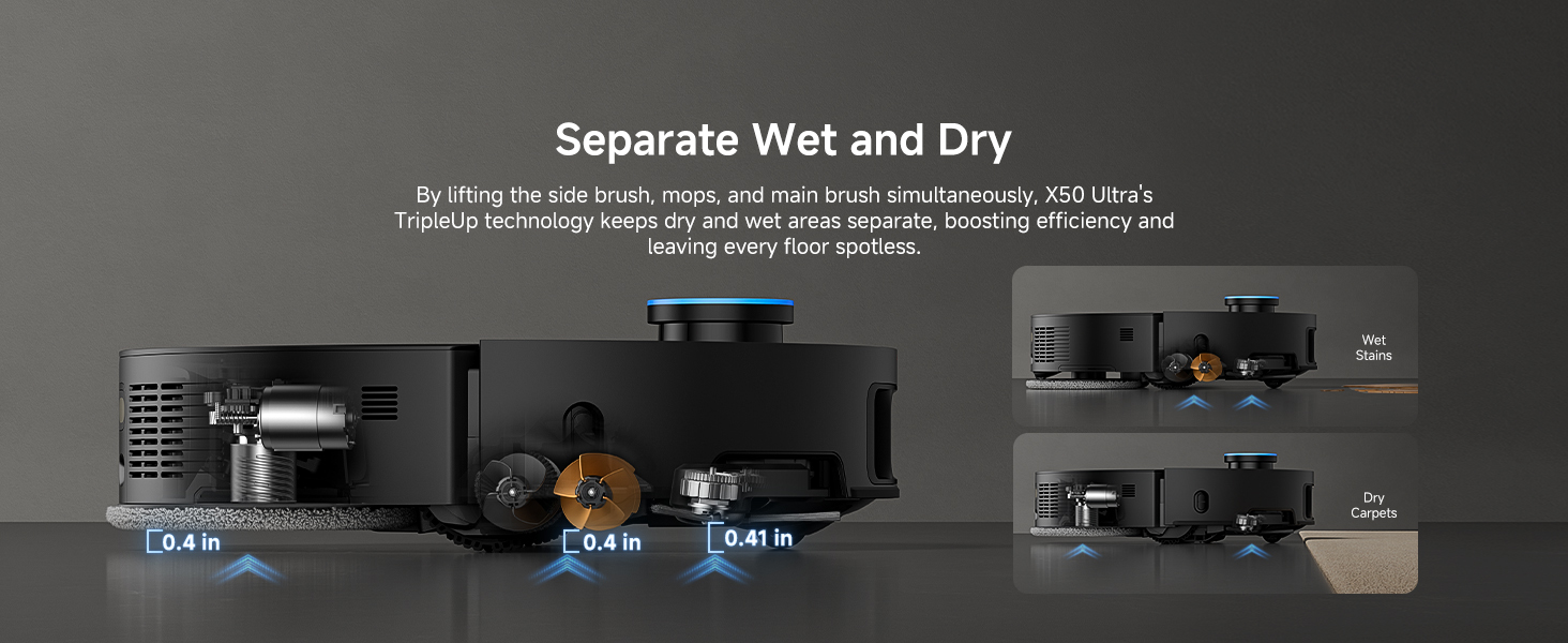 Cross Thresholds and Barriers: X50 Ultra utilizes robotic retractable legs to conquer door tracks, thresholds, and obstacles up to 2.36 in. It uses shocker absorbers and other innovations to minimize impact and noise to delivery a quieter cleaning experience.