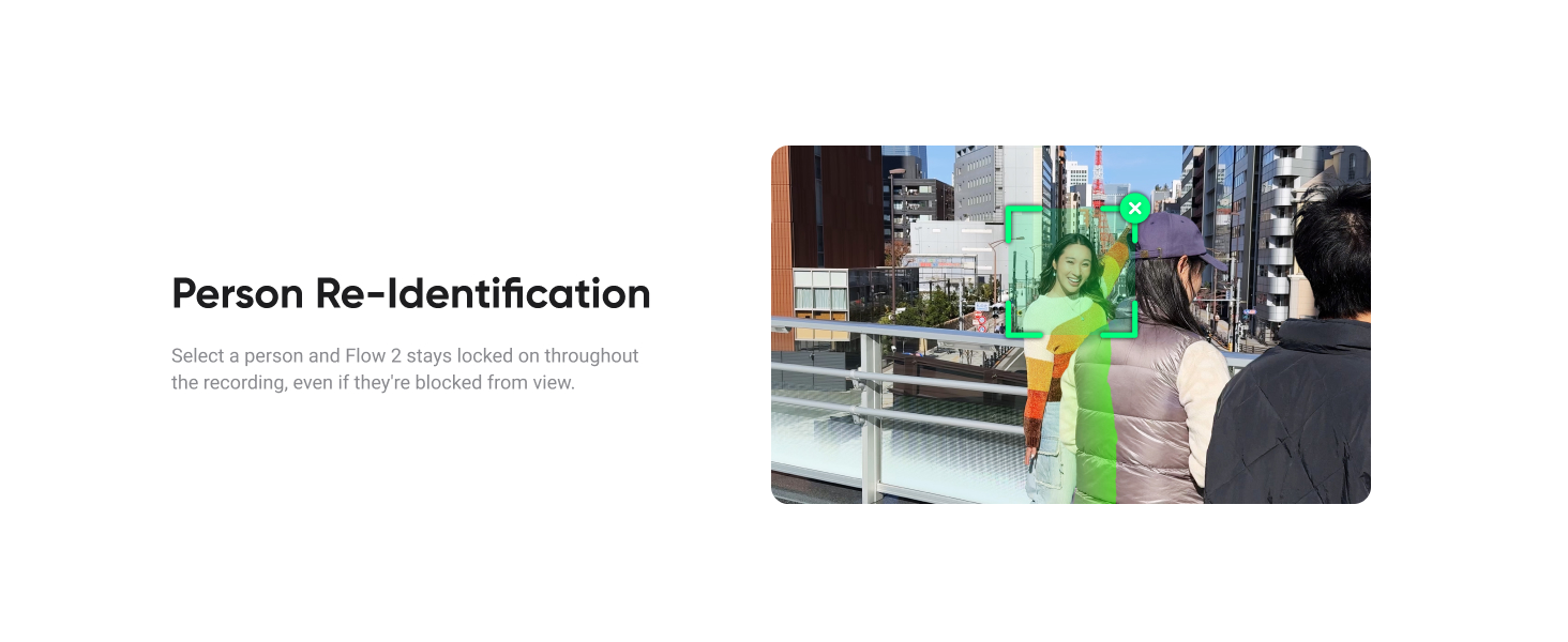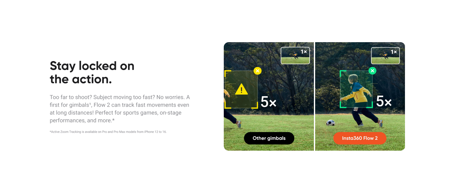 Active Zoom Tracking: A first1 for gimbals, Flow 2 can track fast movement precisely, even at up to 15x zoom! Perfect for sports games, on-stage performances, and more (available for Pro & Pro Max models of iPhone 12-16.)