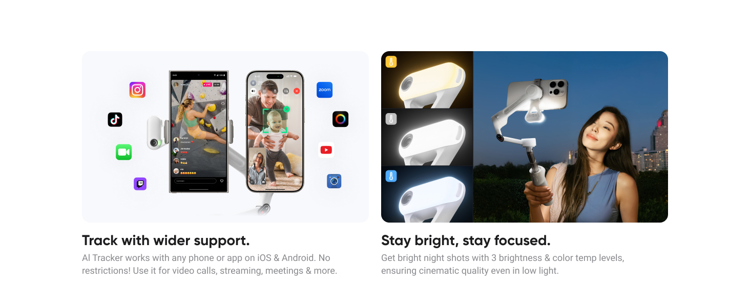 Multi-Person Tracking: A smart phone gimbal that tracks and frames your whole group! Ideal for family gatherings, camping, meetups, and more. Get perfect framing where everyone shines.