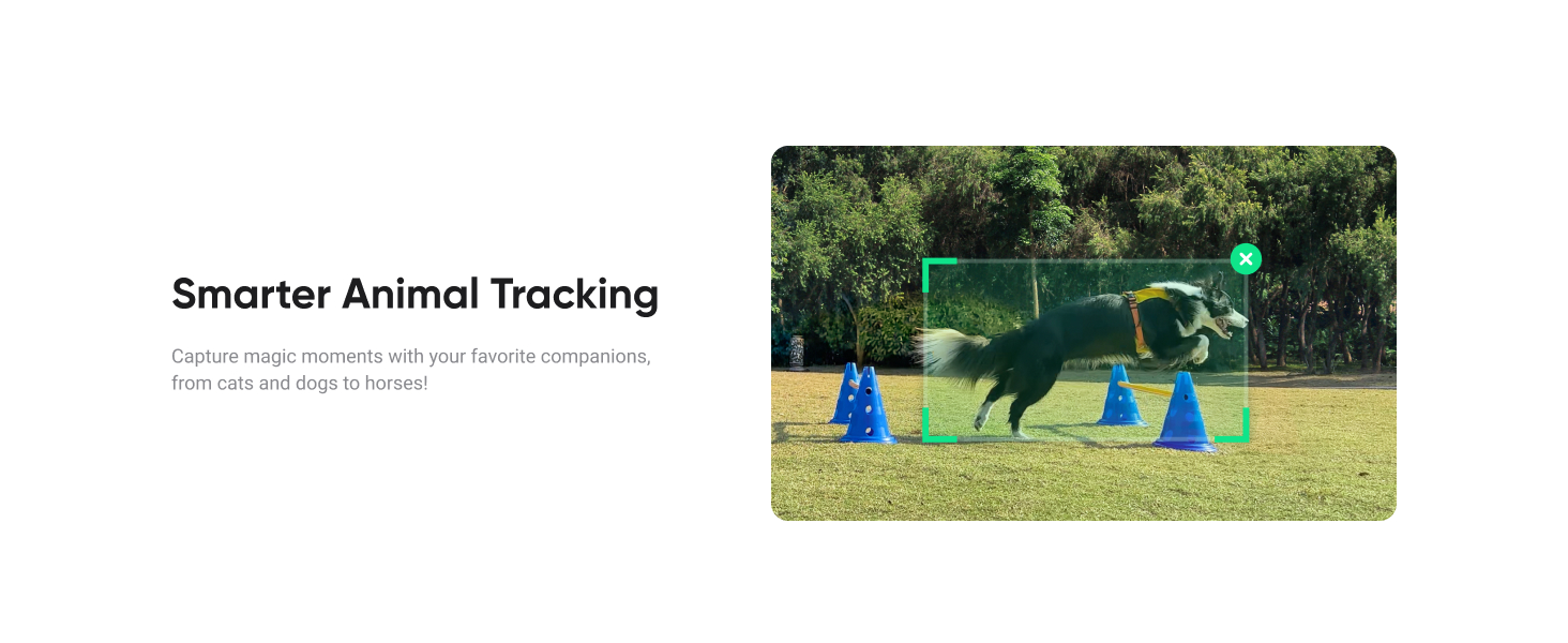 Animal Tracking: Let the camera follow your pets wherever they go. With AI tracking for dogs, cats, and even horses, every playful leap and heartwarming gesture is captured with precision. From cuddly moments to joyful sprints, your pet’s charm is always in focus, making every Vlog a lively and enchanting story.
