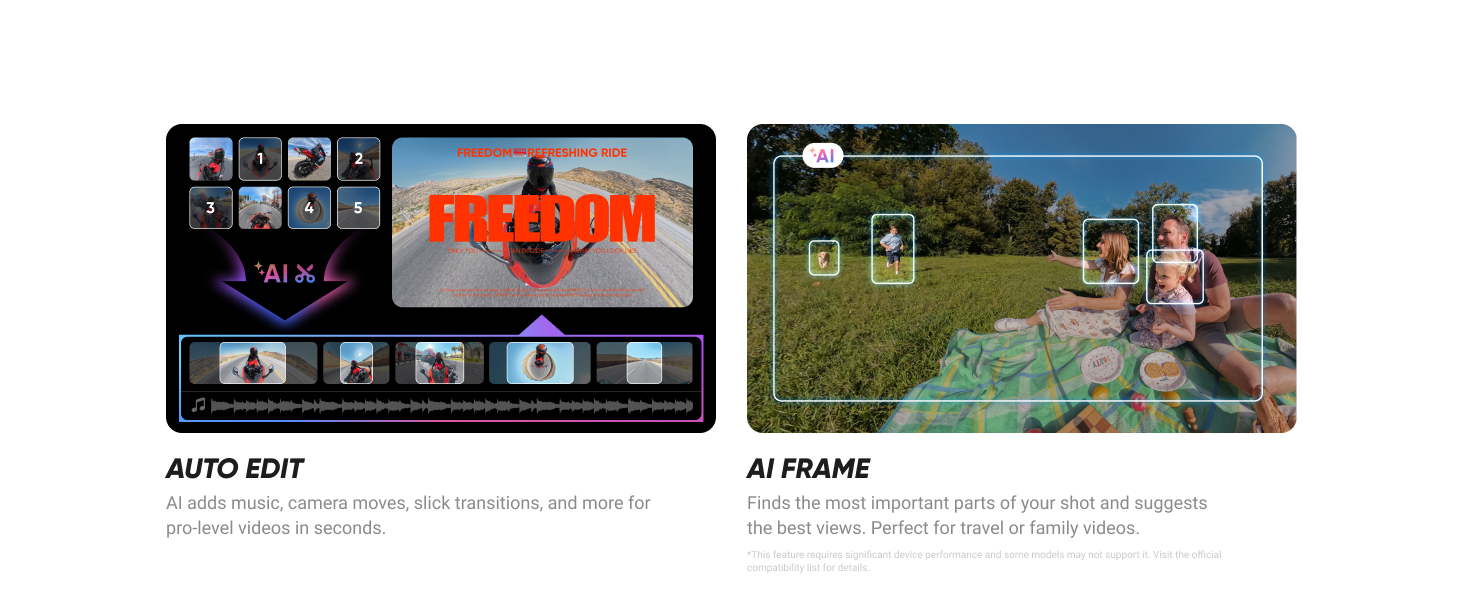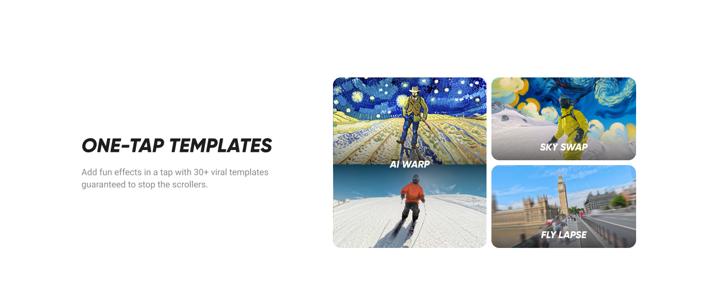 AI-Powered Editing: Use our advanced AI tools to edit a dynamic video and find unique perspectives in the Insta360 app. Tons of one-tap templates, fun effects, and creative tools at your fingertips.