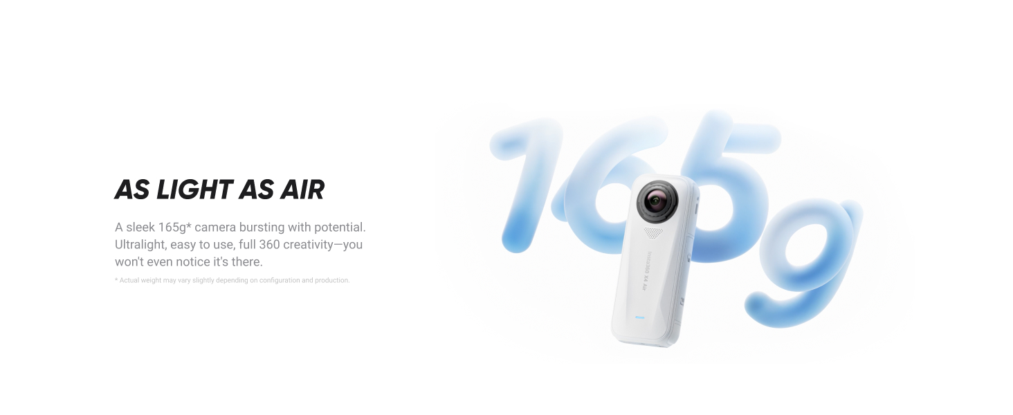 Lightweight & Portable (165g): A sleek 165g* camera bursting with potential. Ultralight, easy to use, full 360 creativity—you won't even notice it's there. *Actual weight may vary slightly depending on configuration and production.