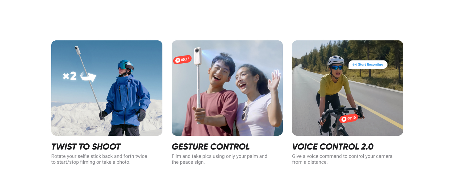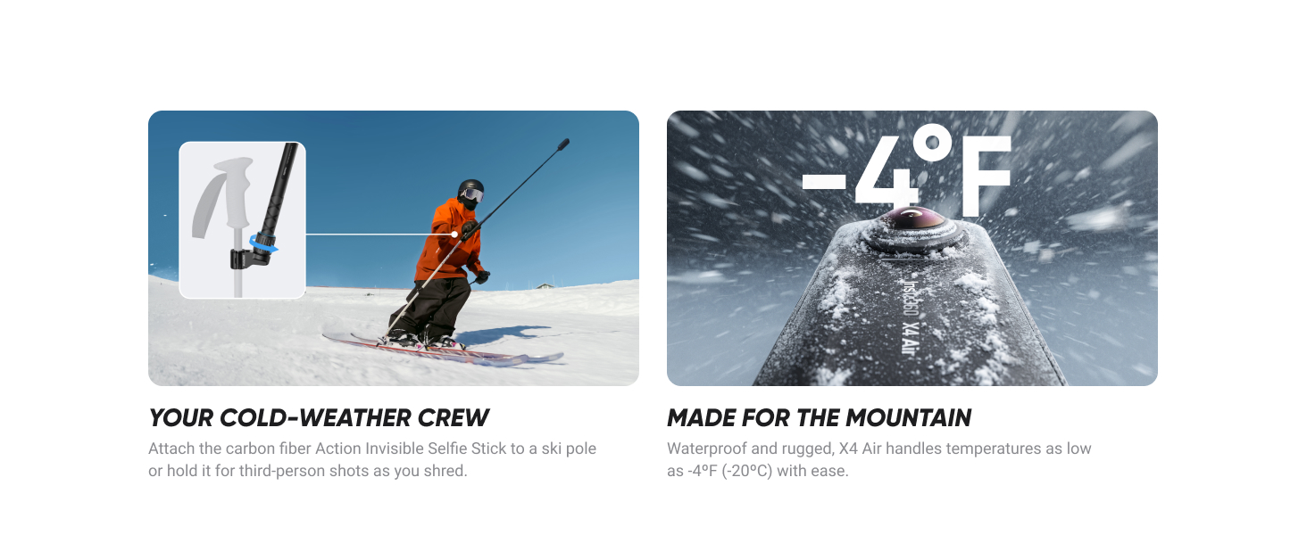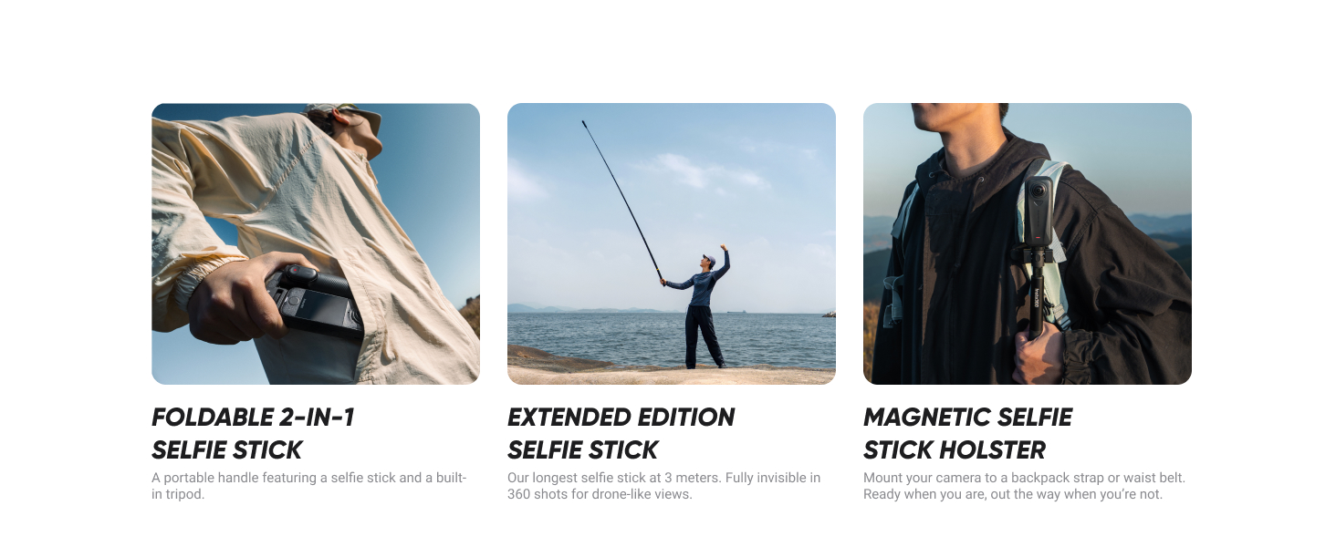 Invisible Selfie Stick Effect: Capture awesome third-person perspectives and drone-like angles with a selfie stick that magically vanishes from your shots. An iconic effect that's impossible with other action cameras. *Invisible Selfie Stick sold separately.