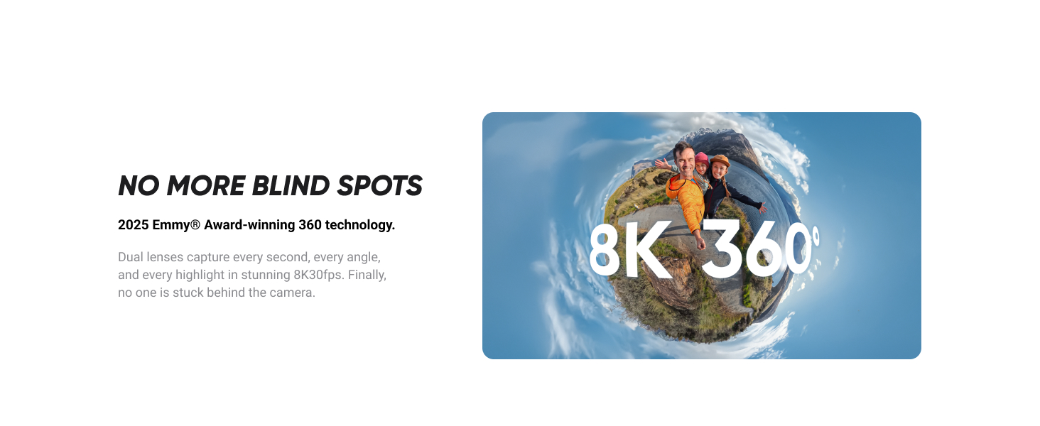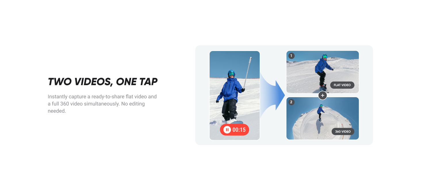 8K 360 Video: Dual lenses capture every second of the family fun, all angles of your favorite spot, and every highlight in stunning 8K30fps. Finally, no one is stuck behind the camera.
