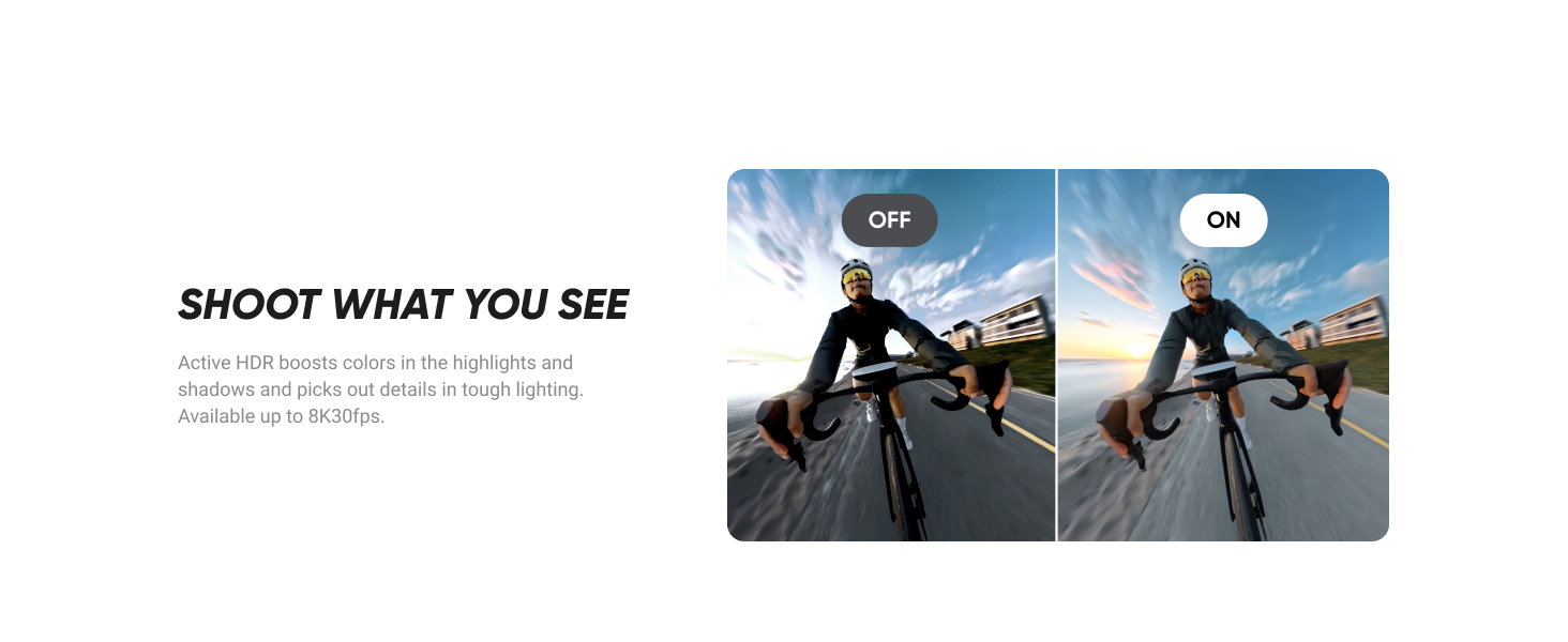 8K30fps Active HDR: An innovative HDR mode for stabilized daytime shots. In tough lighting conditions, Active HDR boosts colors in the highlights and shadows and captures details that other action cameras miss.