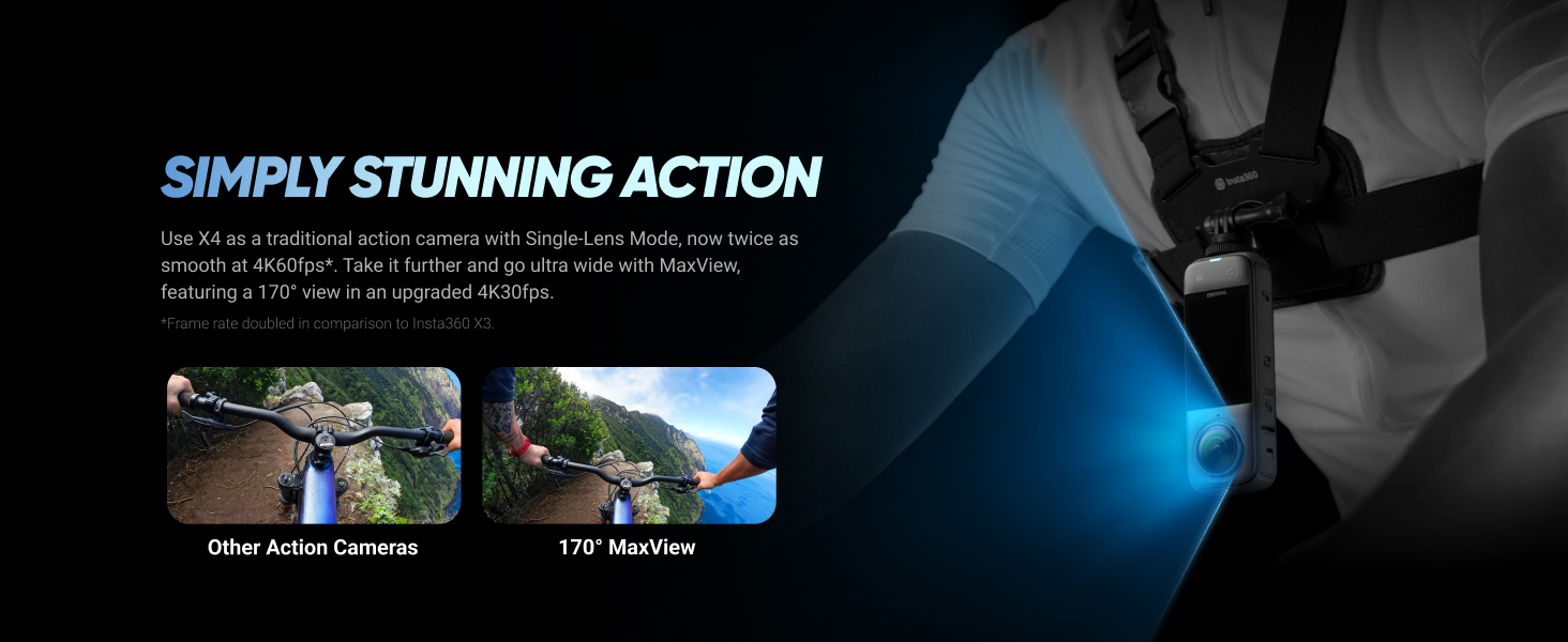 4K & 170° MAXVIEW - X4 can also be used as a wide-angle 4K action camera at a whopping 4K60fps, or get super wide views with the incredible 170° MaxView at 4K30fps.