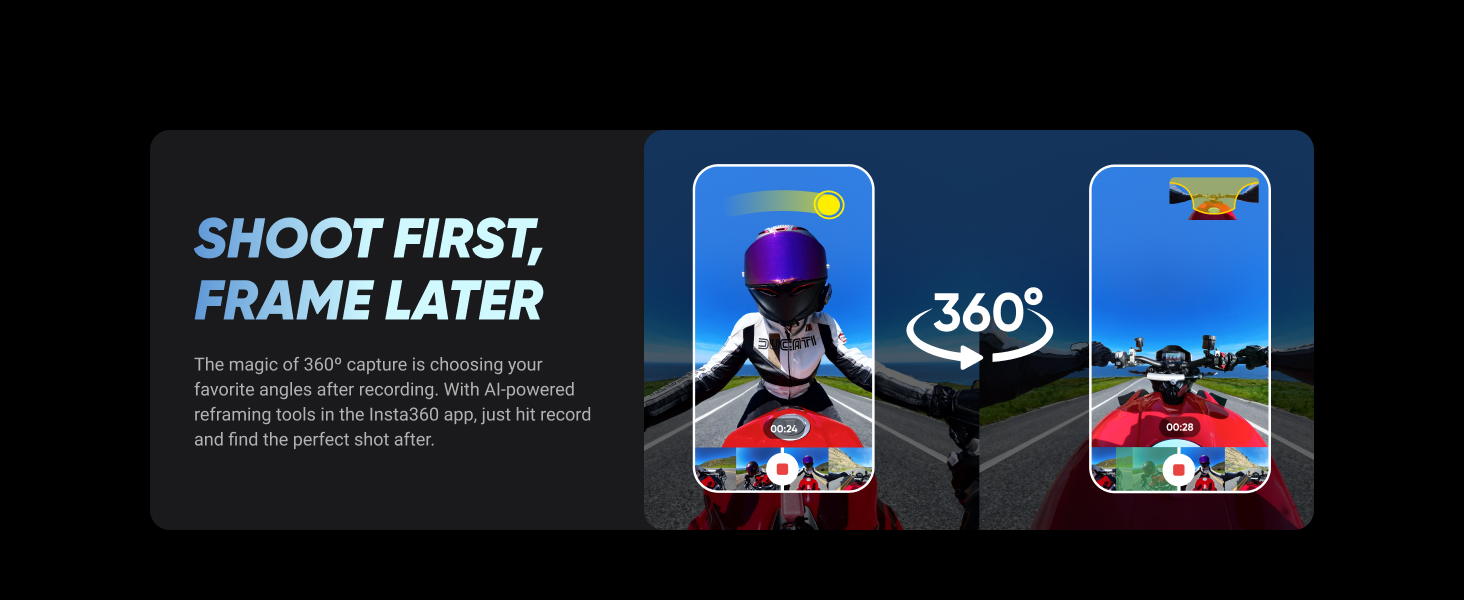 SIMPLE, EASY REFRAMING - With Insta360 X4, get out there and shoot, not having to worry about lining up a shot. Shoot first, then reframe easily after, all in the AI-powered Insta360 app.