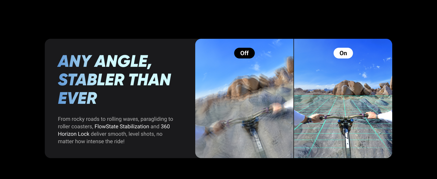 ULTRA STABLE FOOTAGE - FlowState Stabilization and 360° Horizon Lock deliver smooth, level shots, no matter how intense the action is.