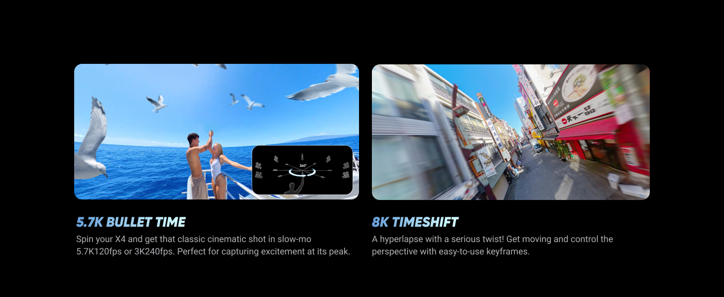 IMMERSIVE 360 VIDEO - The 8K era is here. Insta360 X4 delivers 360° video in stunning 8K or 5.7K60fps! Use Active HDR to keep shots color accurate too, even in action scenarios.